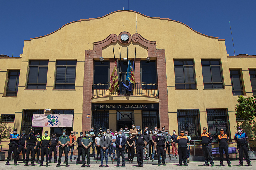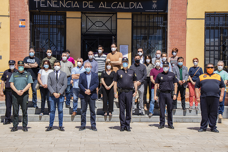 Miembros de la Corporación Municipal, con el alcalde de Sagunto Darío Moreno al frente, y de las Fuerzas y Cuerpos de Seguridad del Estado, así como de Protección Civil y de Vigilancia Rural, y el director del Hospital de Sagunto y gerente del Área de Salud de Sagunto, José Luis Chover, han guardado hoy, viernes 5 de junio, a las 12 horas un minuto de silencio frente a las puertas de la Tenencia de Alcaldía de Puerto de Sagunto. Este acto ha tenido lugar con motivo del final mañana, sábado 6 de junio, de los 10 días de luto oficial en memoria de las víctimas de la COVID-19.