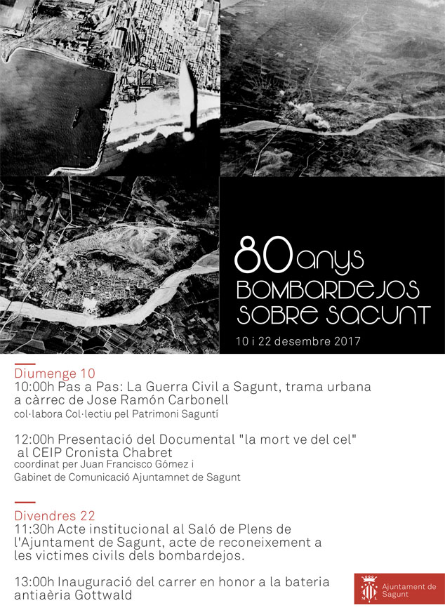 Pocos minutos antes, a las 11.30 horas, tendrá lugar en el Salón de Plenos del Ayuntamiento de Sagunto un acto institucional en el que se hará un reconocimiento a las víctimas civiles de los bombardeos. Además, en este acto, se proyectará de nuevo el documental La mort ve del cel. Más tarde, a las 13 h, será la inauguración de la calle en honor a la batería antiaérea Gottwald.