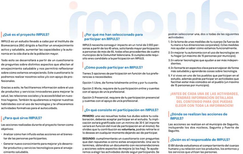 El proyecto IMPULS requiere la participación de personas mayores de 45 años, con mayor implicación de personas de más de 65 años, todas ellas procedentes de municipios de Comunidad Valenciana como Sagunto, Alcoy, Almenara y la Mancomunidad de la Hoya de Buñol, que han sido elegidos para desarrollar la investigación aplicada.