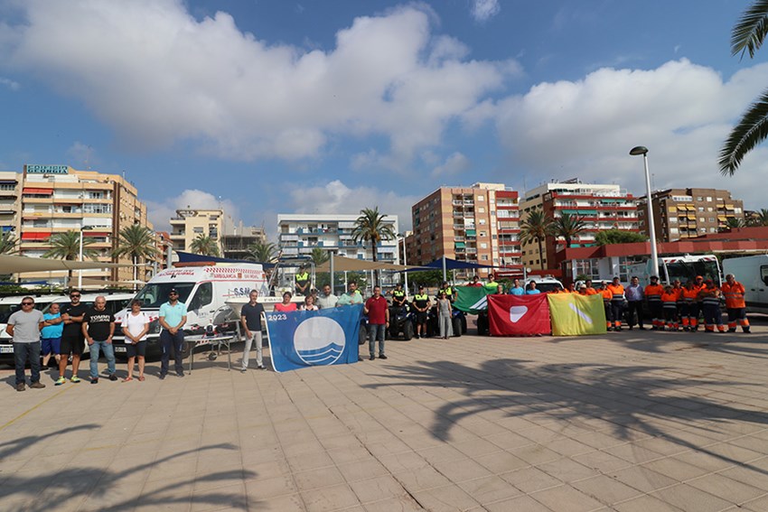 El departamento de Playas, la Policía Local y la Societat Anònima de Gestió (SAG) han presentado esta mañana, en la plaza de la Concordia de Puerto de Sagunto el dispositivo especial de vigilancia y mantenimiento para la zona de las playas del municipio en la época estival. Además, la delegación de Actividad Física, Salud y Deportes ofrece una variada programación deportiva en las playas. También se han mostrado las banderas adaptadas para personas con daltonismo.