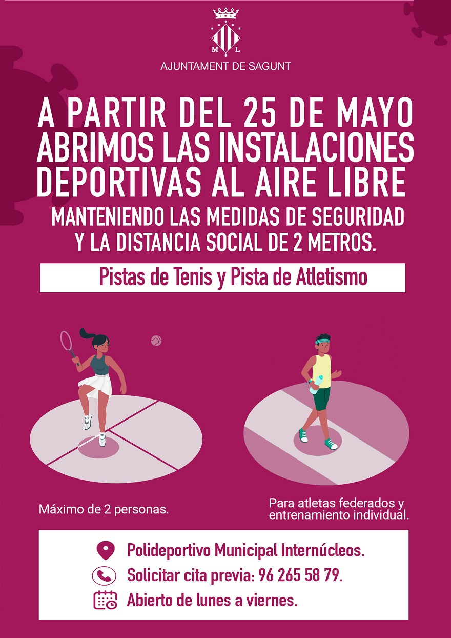 El alcalde de Sagunto, Darío Moreno, ha concretado que el uso de las instalaciones deportivas, ubicadas en el Pabellón Polideportivo Internúcleos, será de lunes a viernes, con cita previa: «Si quieren solicitar esta cita, las personas deberán llamar al teléfono 962 65 58 79. Además, la concejalía ha establecido un protocolo de seguridad e higiene que incluye tanto a los usuarios y usuarias, como al personal que gestiona estas instalaciones. En el caso de las pistas de atletismo, los entrenamientos tienen que ser individuales y solo para personas federadas y, en el caso del tenis, se habla de un máximo de 2 personas. No se podrán jugar dobles».