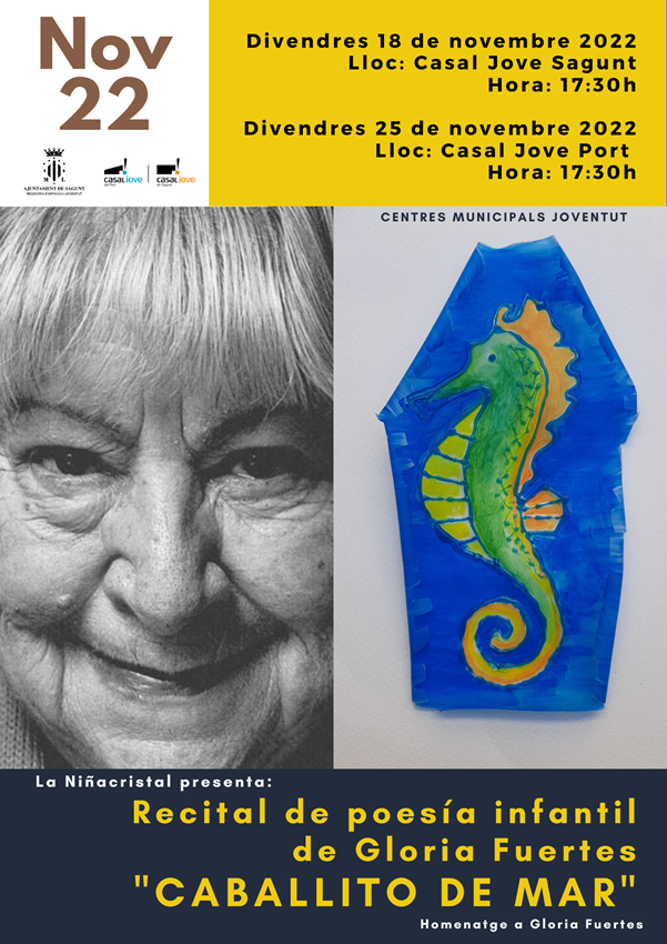El doble recital de poesía infantil será Caballito de mar, que se realizará los próximos días 18 y 26 de noviembre a las 17:30 h en los centros juveniles de Sagunto y Puerto; y la representación teatral será Sin pena y con gloria, sobre su vida y se podrá ver en el Casal Jove del Port el domingo 27 de noviembre a las 19 horas. Solo es necesaria la invitación en la representación teatral, que podrán adquirirse de manera gratuita en www.notikumi.com.