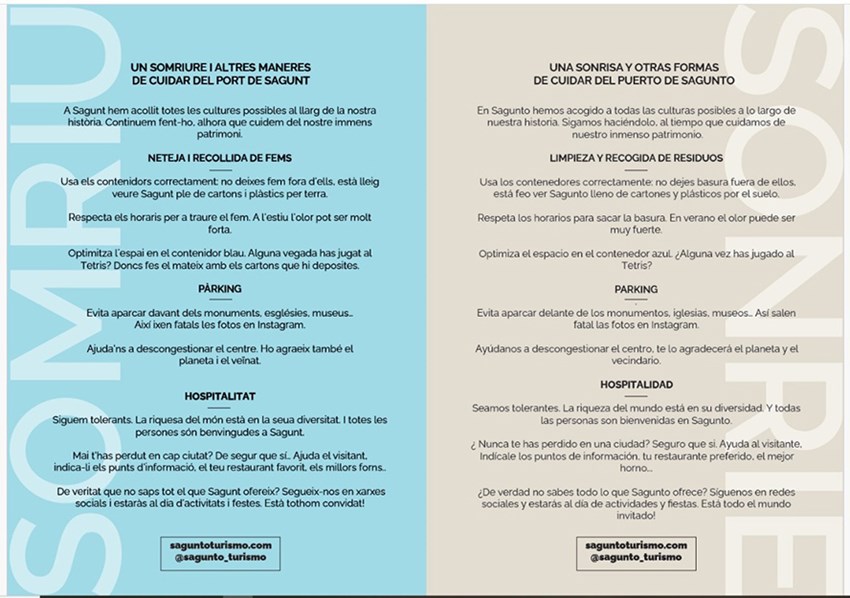 Desde Sagunto Turismo se está llevando a cabo una campaña para concienciar a la ciudadanía de ambos núcleos urbanos para convertir a la ciudad en un destino sostenible. Las acciones de esa iniciativa se han estructurado en 3 áreas: La limpieza y recogida de residuos; el aparcamiento y la circulación de vehículos en el casco antiguo; y, finalmente, la hospitalidad. Para ello, se han diseñado una serie de materiales informativos que desde esta semana están recibiendo las empresas turísticas, los restaurantes, los bares y los propios residentes.