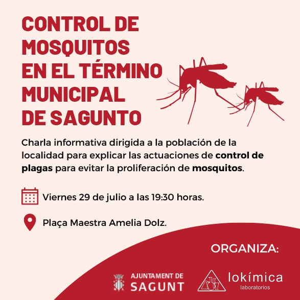 El departamento de Sanidad del Ayuntamiento de Sagunto y la empresa Lokímica, encargada de los controles de plagas en la ciudad, ofrecen esta tarde una charla-taller sobre el control de mosquitos en el término municipal de Sagunto. La plaza Mestra Amelia Dolz de Almardá acogerá este encuentro a las 19.30 horas.