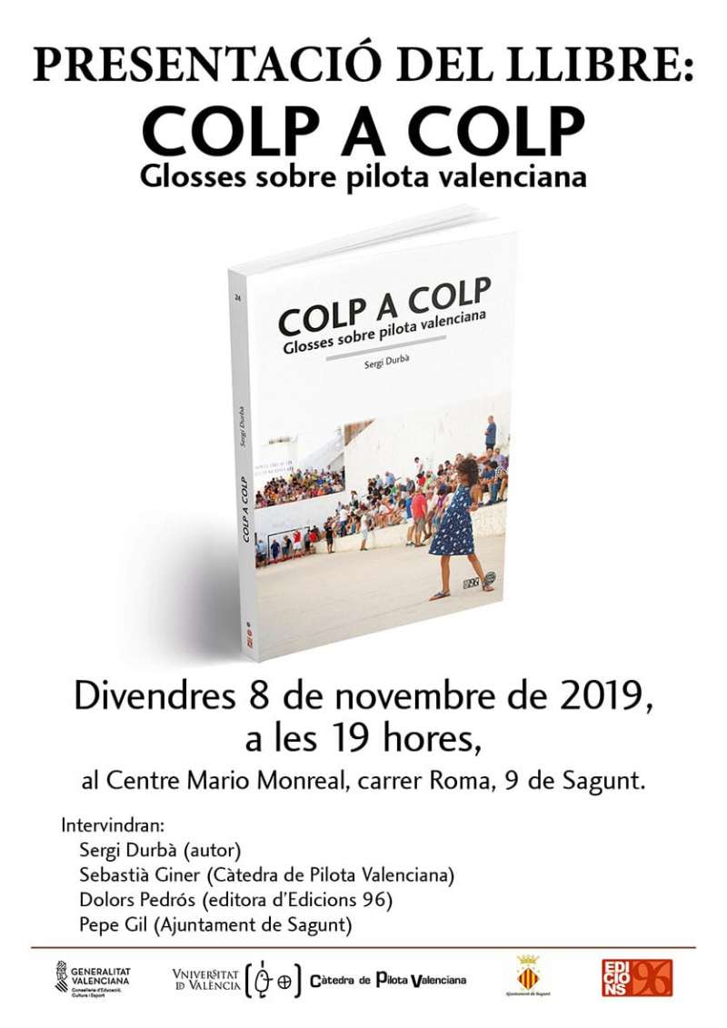 El autor Sergi Durbà presentará el próximo viernes, 8 de noviembre, a las 19 horas su libro Colp a Colp. Glosses sobre pilota valenciana en el aula 2 del Centro Cultural Mario Monreal de Sagunto.