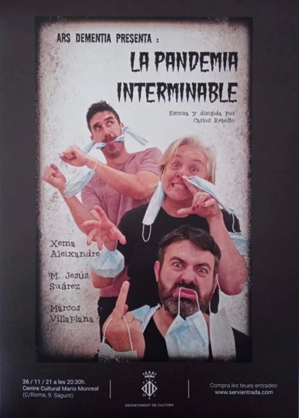 El Centro Cultural Mario Monreal de Sagunto acogerá este viernes, 26 de noviembre, a partir de las 20:30 horas la representación de La pandemia interminable, un espectáculo teatral en clave humorística de la compañía Ars Dementia apta para todos los públicos.
