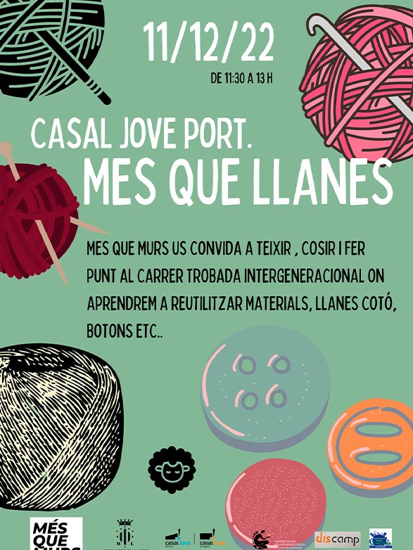 El próximo domingo, 11 de diciembre, entre las 11:30 y las 13 horas, tendrá lugar Más Que Llanes en el patio del Casal Jove de Puerto de Sagunto, un encuentro donde personas de diversa procedencia y edades se unirán para aprender a reutilizar materiales, lanas, algodón, botones, etc. La actividad está abierta a cualquier persona interesada en enseñar o aprender a tejer, coser, hacer punto, etc. y pondrá el punto final del festival de Arte Urbano Més Que Murs.
