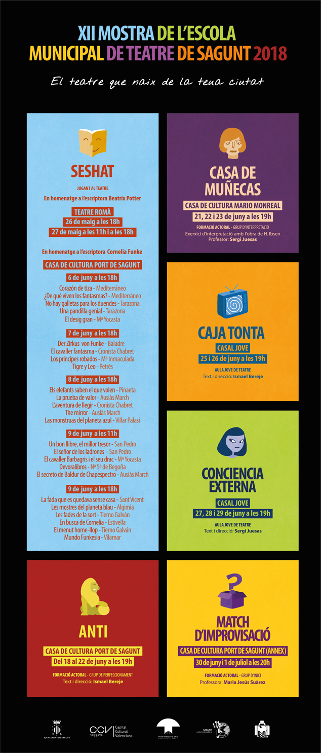 El programa Jugant al teatre de 2018, titulado “Seshat”, está dedicado a las escritoras Beatrix Potter y Cornelia Funke y contará con un total de 25 obras que se representarán en el Teatro Romano y la Casa de Cultura de Puerto de Sagunto por parte del alumnado de infantil y primaria de los diferentes colegios de la ciudad y de la comarca, el 26 y 27 de mayo en el primer escenario y el 6, 7, 8 y 9 de junio en el segundo, en diferentes horarios. Como novedad este año, la propuesta Fireta del llibre es un proyecto por el que se animará a la lectura al alumnado con un intercambio de libros.