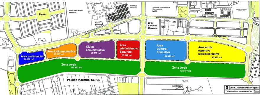 El macrosector VII es una gran área dotacional que está prevista en el Plan General desde el año 1992, que cuenta con unos 16.000 metros cuadrados y que se sitúa entre el área industrial del polígono SEPES y toda la nueva zona comercial que abarca la parte sur de la avenida Fausto Caruana. «El cambio de planeamiento que queremos aprobar definitivamente para el macrosector VII es un tema de gran trascendencia, ya que supone un amplio espacio rectangular que se situaría entre los núcleos de Puerto de Sagunto y Sagunto», explica el concejal de Urbanismo, Quico Fernández.