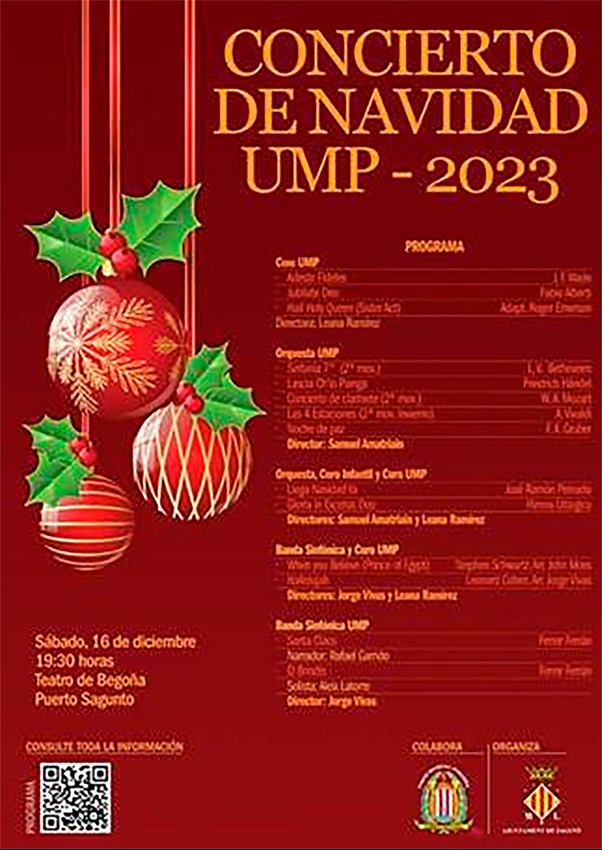 La Unión Musical Porteña ofrecerá su concierto de Navidad 2023 el sábado 16 de diciembre, a las 19:30 horas, en el Teatro de Begoña (c/ Progreso, 38. Puerto de Sagunto). La entrada es gratuita y libre hasta completar el aforo.