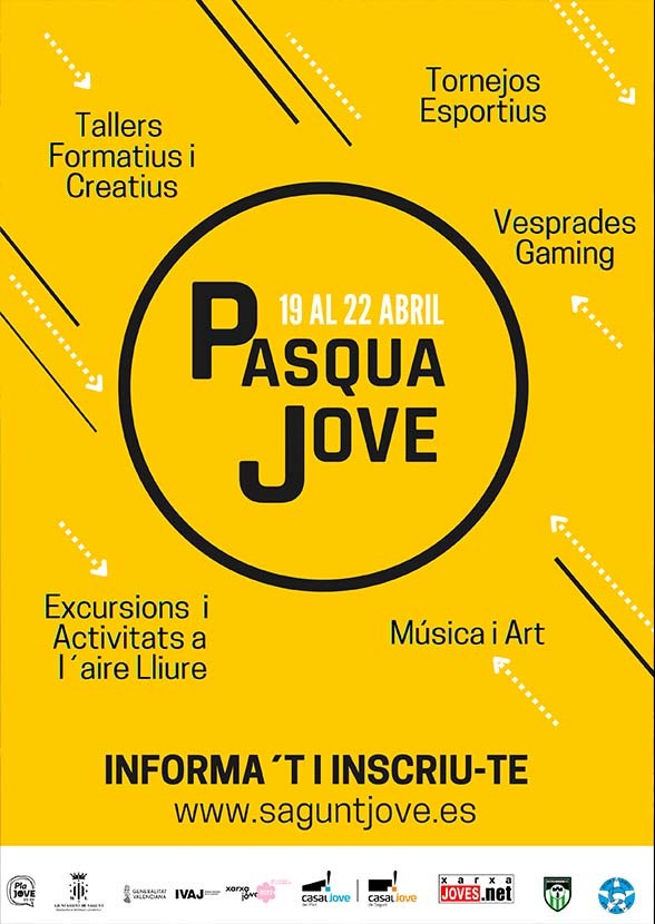 Vuelve como cada año la actividad Pascua Joven para la juventud del municipio los días 19, 20, 21 y 22 de abril. Este año tendrá lugar en los Casales Jove de Sagunto y Puerto de Sagunto, tanto por la mañana como por la tarde. Dentro de su programación hay actividades muy variadas, que se engloban en cinco grandes bloques: Torneos deportivos, talleres formativos, talleres creativos, actividades al aire libre y tardes gaming .