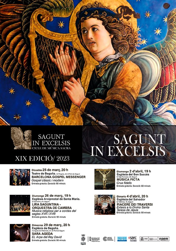 Este sábado 25 de marzo vuelve el ciclo de música sacra Sagunt in Excelsis. En esta ocasión contará con cinco conciertos que se realizarán entre el núcleo de Sagunto, con tres conciertos; y el núcleo de Puerto de Sagunto, con dos conciertos. Además, Asun Moll, concejala de cultura, ha puntualizado: «Empezamos con un concierto de música góspel en el Teatro de Begoña, que será este sábado, estáis todas y todos invitados para disfrutar. Y los otros cuatro ya serán dentro de las iglesias: Begoña, El Salvador, Buen Suceso y Santa María.»