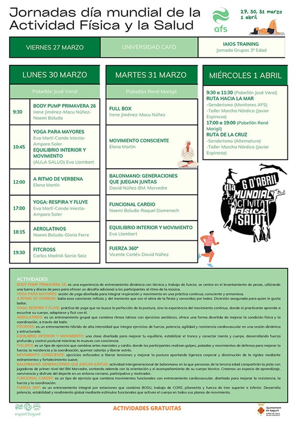 El Ayuntamiento de Sagunto, a través del área de Actividad Física, Salud y Deportes y con la participación de diferentes programas municipales, organiza varias jornadas de actividades saludables gratuitas con motivo del Día Mundial de la Actividad Física y la Salud.