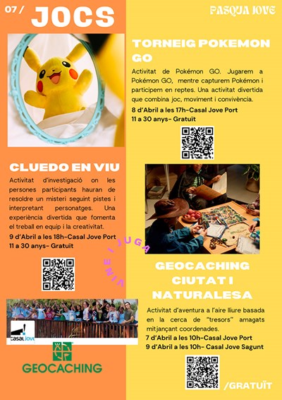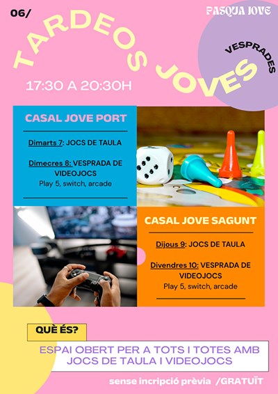 En lo que respecta a la segunda jornada, la del miércoles 8 de abril, se han programado en ambos Casals Joves sendos campus matinales de 10:00 a 14:00 horas para público de entre 11 y 14 años. Además, en el de Puerto de Sagunto habrá un torneo de Pokémon GO a las 17:00 horas, para un público de 11 a 30 años; un taller insproject inclusivo de 17:30 a 18:30 horas; y un tardeo dedicado a los videojuegos (PlayStation 5, Nintendo Switch y arcade) de 17:30 a 20:30 horas. Por otra parte, en el de Sagunto se ha previsto una formación sobre primeros auxilios de 17:00 a 21:00 horas para un público de 12 a 30 años; y un taller de transfer para gente de entre 11 y 30 años a las 18:00 horas. Asimismo, en el colegio Cronista Chabret de Sagunto se organiza un torneo de baloncesto a 3 de 9:00 a 14:00 horas para jóvenes de 14 a 24 años. Y desde la estación de tren se organiza una salida a Valencia de 9:00 a 14:00 horas con visita al Casco Histórico y al Centro de Cultura Contemporánea del Carmen, pensada para público de 11 a 30 años (cada persona se paga su billete de Cercanías).