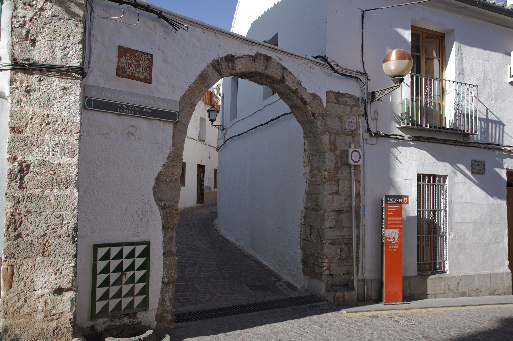 Seguint el carrer i també a la nostra dreta trobem el Portalet de la Jueria o de la Sang, arc de mig punt, l'únic autèntic de l'època. Per raons de seguretat, però també per preservar la seva identitat, l'aljama va demanar l’any 1321 permís per a construir un mur que els separés de la resta de la ciutat, el qual va ser concedit per Jaume II. En realitat, es tractava simplement de tancar els accessos al barri, deixant solament alguns passatges oberts. Hui en dia es conserva un d'estos accessos, el portalet de la Jueria o de la Sang.