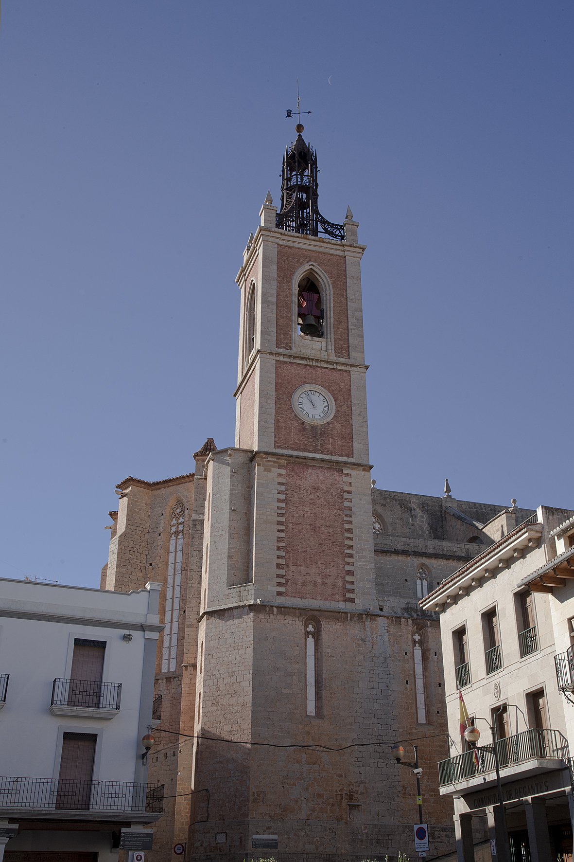 Mirant a l'altar major, a mà esquerra, es veu una portella que dóna accés al campanar. Del campanar original cal fer constar que es trobava en un estat ruïnós des del període de la invasió francesa, per la qual cosa es va decidir enderrocar-lo i procedir a una nova construcció. La seva altura és de 58 metres i 235 esglaons; l'escala és estreta i en forma de cargol. La sala del campanar té 17 metres quadrats i compta amb 8 campanes, 6 de bronze i 2 de fusta o matraques. Totes les campanes tenen el seu nom propi: Santa Teresita, Santa Maria, Sants Patrons, Crist Rei i, les dues més menudes, Sant Tarsici i Santa Eulàlia, més conegudes popularment pel nom de «les campanes de la bona mort». Les matraques s'utilitzen en els actes de la nostra Setmana Santa. Cal fer menció especial al Cimboriet, una campana que es troba a la part més elevada del campanar, en el pinacle de ferro, forjat en la siderúrgia local, que el corona juntament amb un penell.