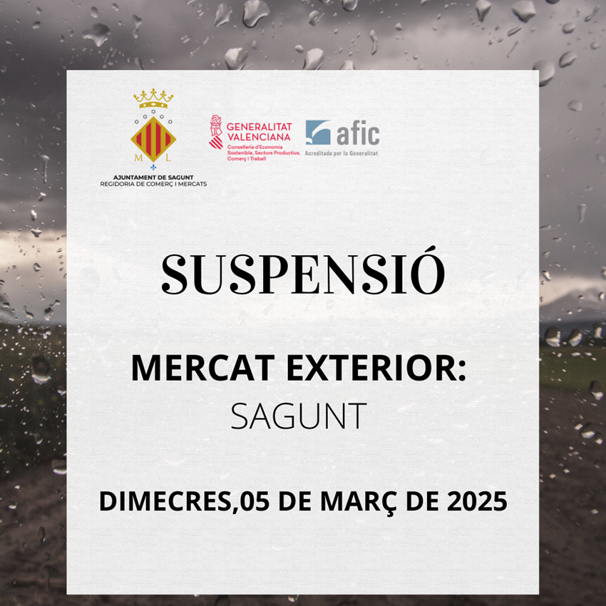 La Regidoria de Comerç i Mercats de l'Ajuntament de Sagunt ha decretat la suspensió del mercat exterior fix que s'anava a instal·lar demà dimecres en el nucli de Sagunt.