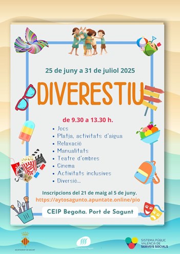 El Diverestiu es desenvoluparà del 25 de juny al 31 de juliol amb un horari de 9.30 a 13.30 hores en el CEIP Begoña del Port de Sagunt. El període d'inscripcions serà del 21 de maig al 5 de juny i es realitzarà de manera telemàtica.