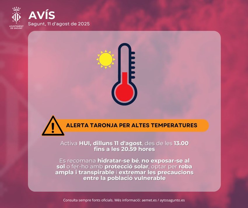L'alerta per calor extrema, derivada de l'onada de calor que afecta Sagunt i el litoral nord de la província de València, s'ha elevat a nivell taronja (risc important) per part del 112 Comunitat Valenciana. Esta alerta estarà activa des de les 13.00 fins a les 20.59 hores de hui, dilluns 11 d'agost.