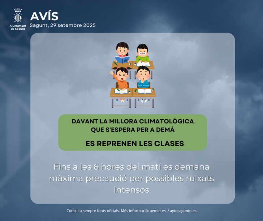 El Camp de Morvedre, organitzat a través del Grup d’Emergències comarcal, ha decidit reprendre, demà, dimarts 30, l’activitat ordinària dels col·legis i instituts. La decisió ve motivada per una millora de les previsions meteorològiques a partir de les 6.00 h de demà.