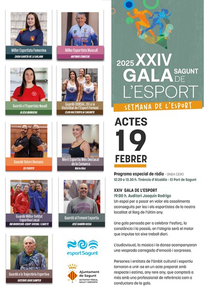 A la vesprada, a les 19 hores, se celebrarà la XXIV Gala de l'Esport de Sagunt a l'Auditori Joaquín Rodrigo. Es concediran un total de 9 premis i guardons a esportistes i clubs locals pels seus mèrits i èxits aconseguits. Concretament, s'entregarà el premi a Millor Esportista Femenina a Zaida García, el premi a Millor Esportista Masculí a Antonio Comeche, el guardó a l'Esportista Novella a Alicia Munuera, el guardó DORSAL 216 a la Visibilitat en l'Esport Femení al Club Halterofilia Sagunto, el guardó Valors Humans al CB Puerto, el guardó al Mèrit Esportiu Més Destacat de la Comarca a Nuria Díaz, el guardó a Millor Entitat Esportiva Local a l'equip juvenil i cadet del BM Morvedre, el guardó al Foment Esportiu a José Ramón Ojeda, i el guardó a la Trajectòria Esportiva a Gustavo Juan Samper.