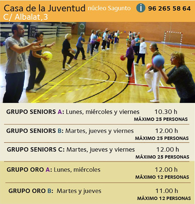 La delegació d’Esports de l'Ajuntament de Sagunt ha posat en marxa la nova temporada de les seues dos iniciatives: Troba el teu temps i Activa’t. La primera oferix activitats esportives destinades tant a xiquets (de 3 a 6 anys) com a adults (de 14 a 60 anys). La segona d'estes iniciatives, Activa’t, està destinada a ajudar a les persones majors a mantindre un estil de vida saludable i realitzar l'activitat física necessària per a gaudir d’una bona salut.