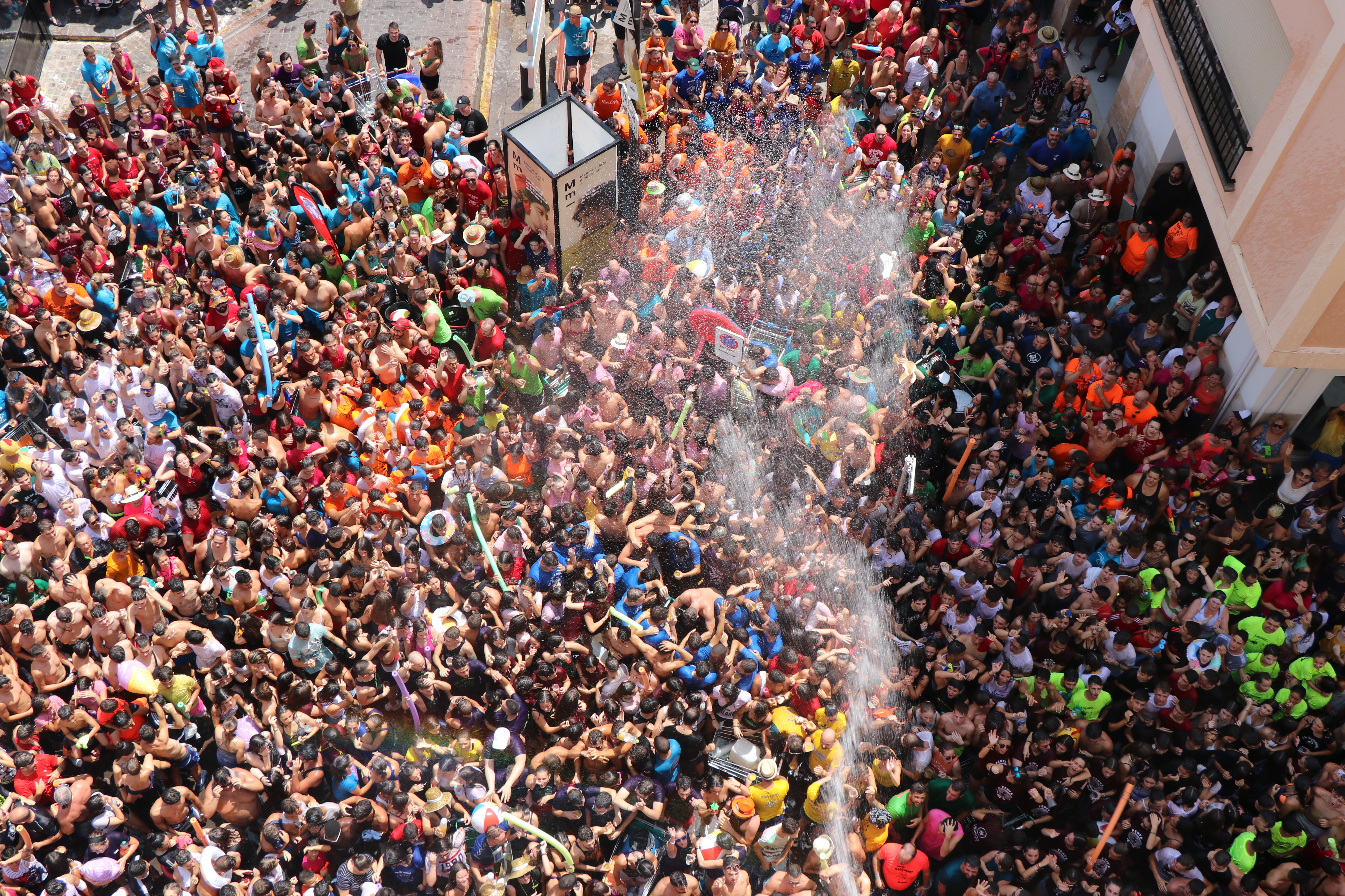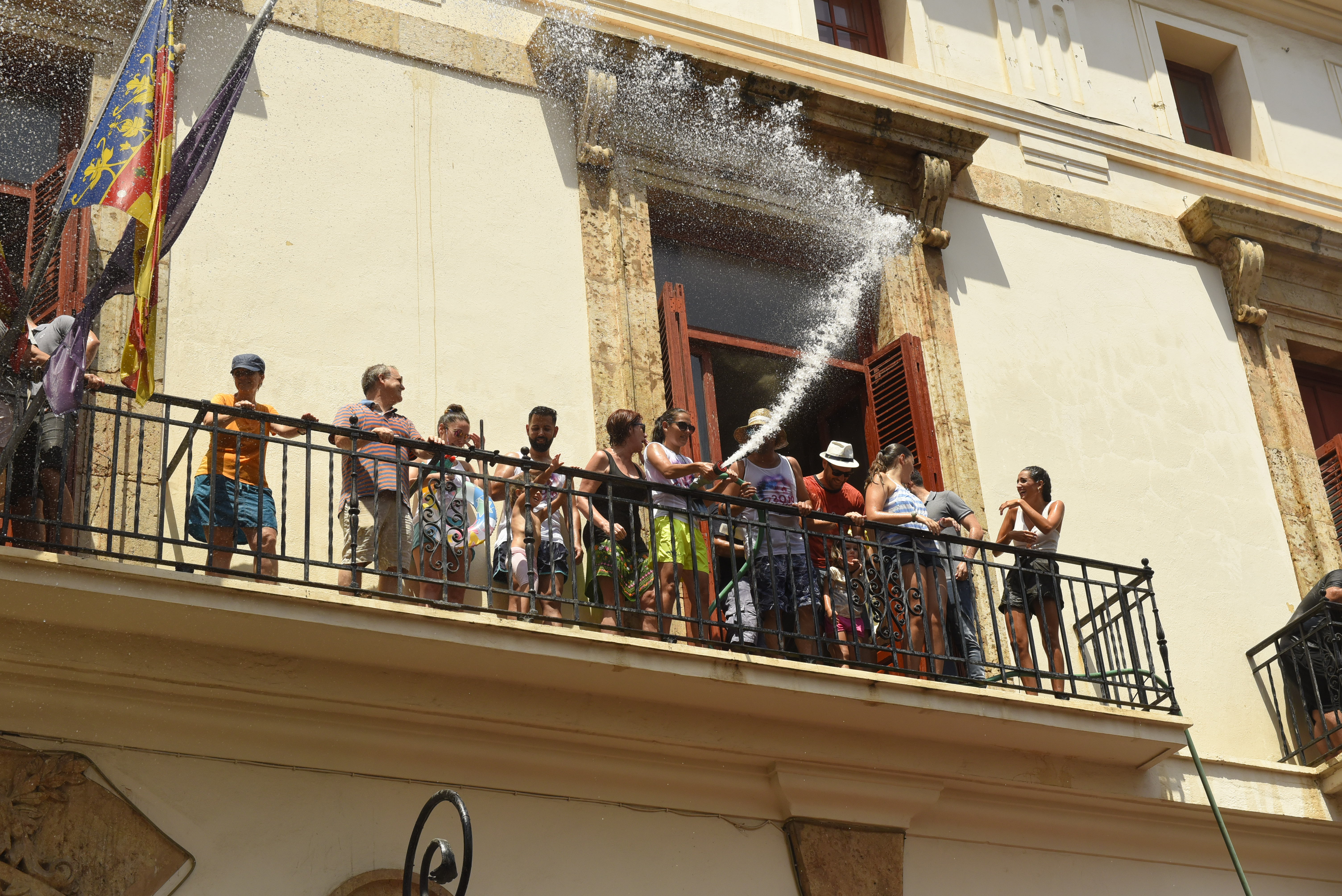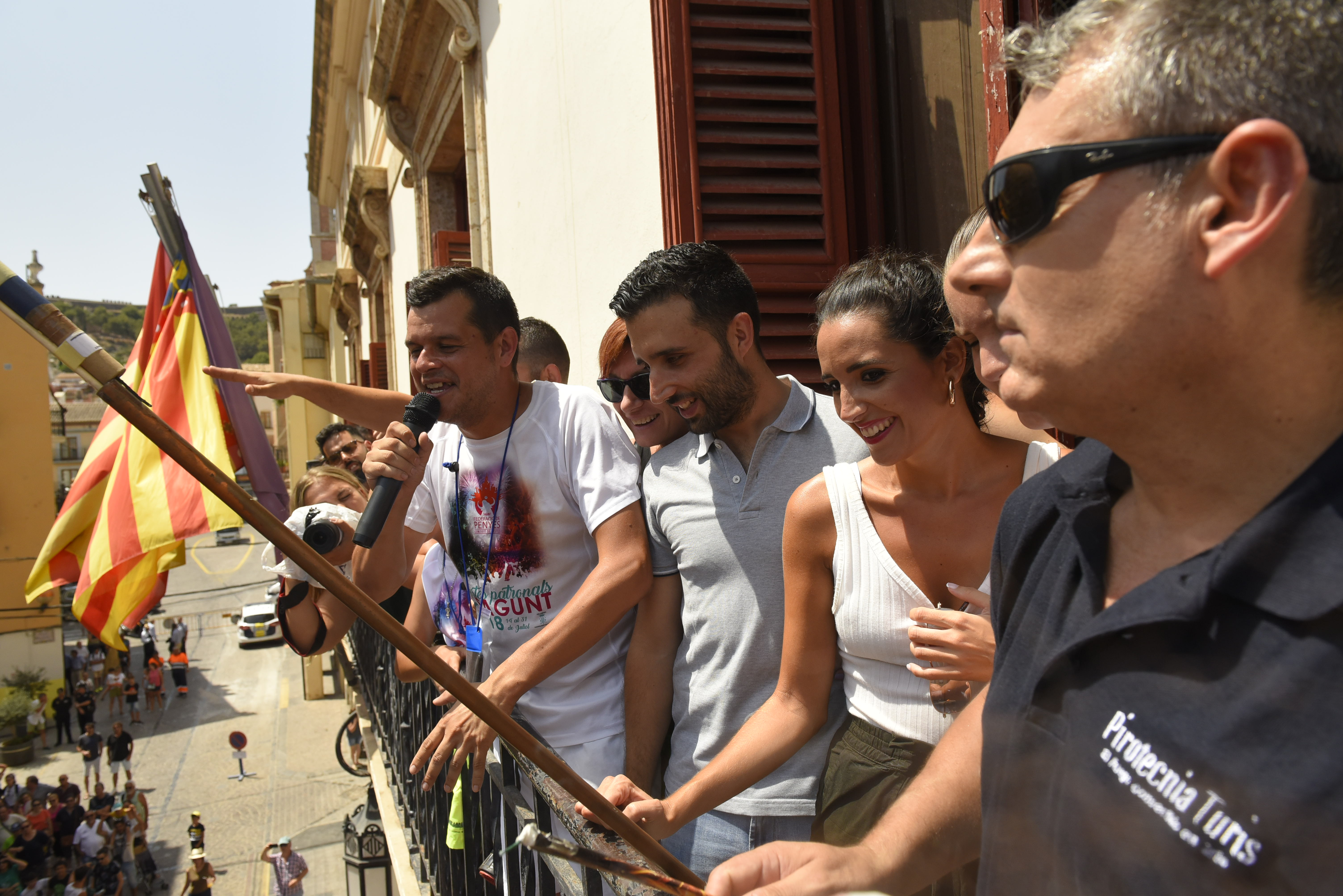 Sagunto ya está en fiestas. Hoy, sábado 13 de julio, el Ayuntamiento de Sagunto ha congregado a una multitud de peñistas a sus puertas para el tradicional Tro d’Avís que anuncia la llegada de las fiestas patronales oficialmente, seguido de la Xopà desde el balcón del consistorio.