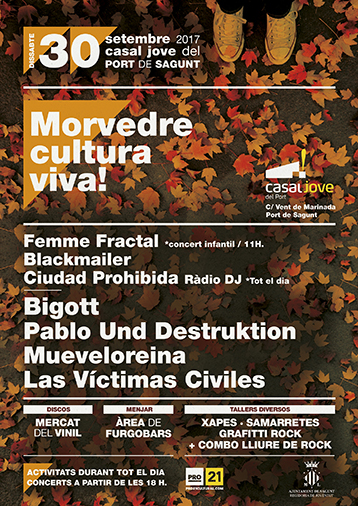 El pròxim dissabte 30 de setembre el Casal Jove del Port de Sagunt acollirà durant tot el dia una jornada lúdica, festiva i musical amb espais per a totes les edats. Es tracta de Morvedre Cultura Viva!, un festival de música en directe per a tots els públics que comptarà amb tallers infantils, xarrades sobre música, furgonetes amb menjar, radio en directe i fira del vinil.