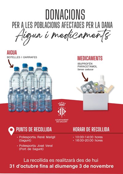 D'altra banda, per a totes aquelles veïnes i veïns que desitgen col·laborar s'han habilitat dos punts de recollida, situats en el Pavelló René Marigil i en el Pavelló José Veral, d'aigua embotellada i medicaments, concretament, Ibuprofeno i Paracetamol.