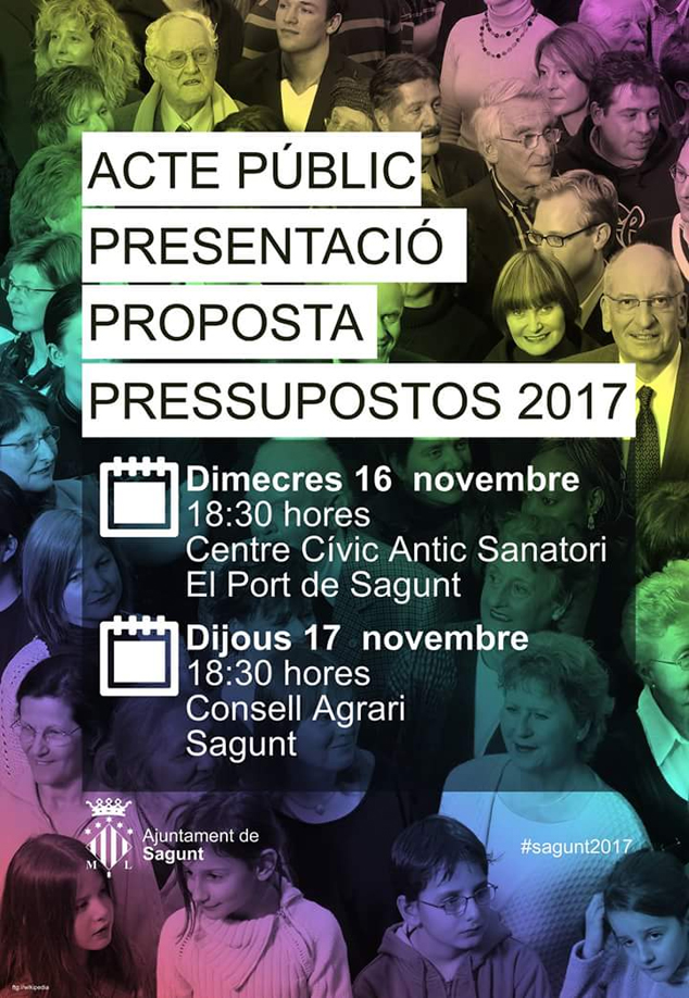 L'Equip de Govern de l'Ajuntament de Sagunt (Compromís, EU i ADN Morvedre) ha convocat dos actes públics per a presentar-li a la ciutadania la proposta de pressupostos municipals per a 2017. El primer d'ells tindrà lloc el dimecres, 16 de novembre, a partir de les 18:30 hores en la sala d'actes del centre cívic Antic Sanatori de Port de Sagunt. El segon, serà el dijous, 17 de novembre, a la mateixa hora en la sala d'actes del Consell Agrari de Sagunt a la Plaça de la Trinidad.