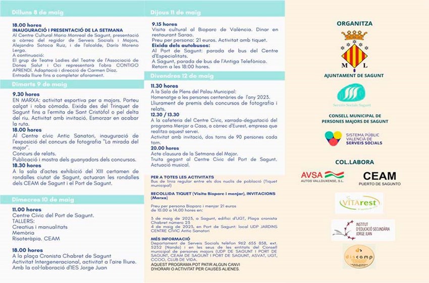La 18a Setmana Cultural de les Persones Majors tindrà lloc des del dilluns 8 fins al divendres 12 de maig, en la qual s'oferiran diferents activitats organitzades des del departament de Serveis Socials de Sagunt, amb la col·laboració de Consell Municipal de Persones Majors de Sagunt i el Sistema Públic Valencià de Serveis Socials, junt a diverses entitats i associacions.