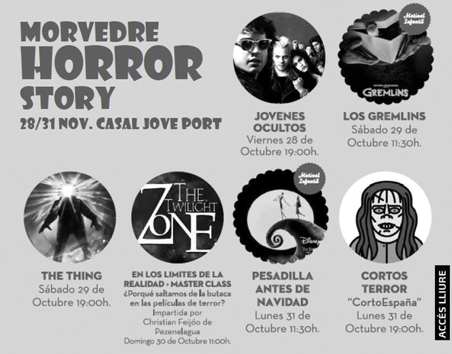 La delegació de Joventut de l'Ajuntament de Sagunt ha preparat una variada oferta d'activitats perquè tots els que ho desitgen puguen gaudir com mai de la festa de Halloween des del divendres fins al dilluns. Quatre dies amb iniciatives dirigides a públic de diferents edats, encara que algunes d'elles, com la del cicle de cinema, el Morvedre Horror Story, és per a tots els públics que podran gaudir de pel·lícules clàssiques de terror dels anys 80 des del divendres fins al mateix dilluns.