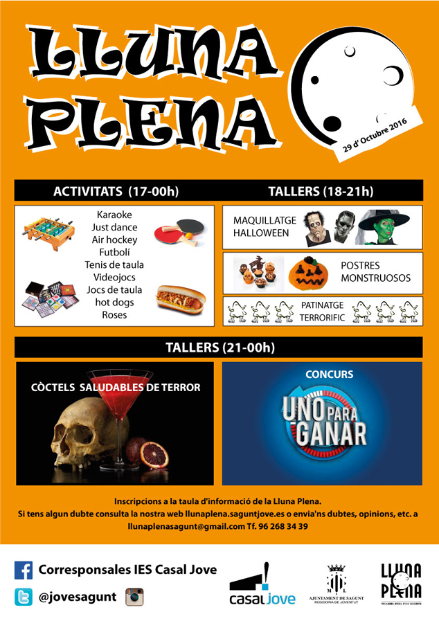 El dissabte per a l@s joves dels IES, i la resta que desitgen participar, s'ha programat LLuna Plena, un conjunt d'activitats des de les 17 hores, i tallers des de les 18 a les 21 hores, així com un concurs que porta com a nom “Un per a Guanyar”. (Totes les activitats i horaris estan detallats en els cartells que publiquem).