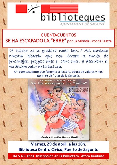 Així mateix, el passat 2 d'abril, el Dia del Llibre Infantil i Juvenil, ja es van celebrar activitats que van resultar un èxit de participació i d'acceptació. El dia 1, i com a avantsala a esta data, es va realitzar a la Biblioteca del Centre Cívic una animació lectora a càrrec del grup teatral local Camí de Nora en el qual es va fer referència als clàssics valencians a través de les rondalles. Una setmana més tard es va realitzar un altre taller per a xiquets de 5 a 8 anys a la Biblioteca Cronista Chabret, titulat Se ha escapado la erre, i que va rebre un primer premi nacional de literatura infantil. Es representarà de nou en el Centre Cívic el dia 29.