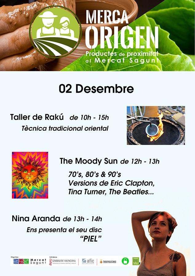 Com cada dissabte de matí, este 2 de desembre MercaOrigen torna al mercat municipal de Sagunt. S’oferirà una bona diversitat de productes artesanals com ara oli de Viver, confitures, patés, cerveses artesanals, verdures ecològiques de l’Horta, joieria, cosmètica, etc. Es tracta de productes frescos i de qualitat comprats directament als productors. A més a més, continua l’oferta de cultura i art en directe, en este cas els assistents podran gaudir amb la participació d’artistes de la nostra localitat.