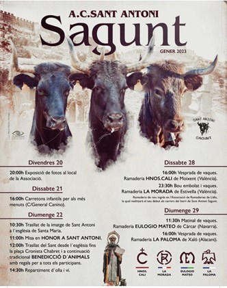 Sagunt celebra la festivitat de Sant Antoni este cap de setmana amb una programació que organitzen diverses associacions del municipi, en col·laboració amb el departament de Festes de l'Ajuntament, i que està repleta d'activitats. Els festejos tindran lloc en els dos nuclis de població, començaran el divendres, 20 de gener, i es prolongaran fins al diumenge, 29 de gener.