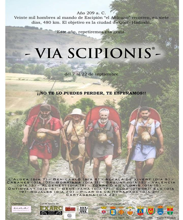 El projecte Via Scipionis emula un fet bèl·lic de la II Guerra Púnica, que recrea l'itinerari recorregut, l'any 209 aC, per quatre legions romanes comandades per Publio Scipión per a atacar la base de subministrament de les tropes cartagineses d'Aníbal que estaven instal·lades a Cartagena. Tractant d'emular el recorregut original, el grup de recreació, que ja ha passat per l'Aldea, Benicarló, Alcalà de Xivert i Cabanes, continuarà, després del seu pas per Sagunt, cap a València, Algemesí, Torre d’en Lloris, Ontinyent, Beneixama, Elda, Elx, Rojales, Pilar de la Horadada i Cartagena, finalitzant en esta ciutat el dia 22.
